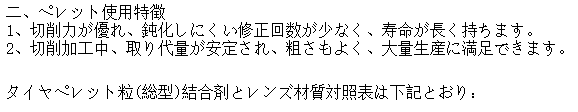 レンズタイプ | 耐摩耗度範囲 | 代表硝材 | 金屬結(jié)合剤 | 樹脂結(jié)合剤 | 大徑 | 小徑 | 大徑 | 小徑 | A | 80以下 | S-LAH66,S-LAH55, S-LAH58,S-LAH60, S-LAH64,TAFD5, TAFD30,LAC8,TAC8 | ZM24 ZM366 | ZM24 ZM30 ZM20 | ZR2 | ZR2、ZR3 | B | 80-150 | BSC7,BAC4,BACD, E-F,S-BSL7,S-BSM, S-BAL,S-BAH,S-TIM | ZM24 ZM366 ZM26 | ZM24 ZM30 ZM20 | ZR2、ZR3 | ZR2、ZR3 ZR7、ZR707 | C | 150-260 | S-TIH,S-LAM, E-FD1,FD60,FD110, E-FDS1,FDS90 | ZM26 ZM24 ZM21 ZM22 | ZM24 ZM10 ZM26 ZM20 | ZR3、ZR707 | ZR7 ZR707 | D | 260以上 | FCD1,PCD4, S-FPL,S-PHM | ZM21 ZM22 | ZR7K1000# | ZR707 | ZR707 ZR465 | G | 平面用ペレット | | | ZR717K1000# | H | 皿修正用ペレット | ZM23Q1000# ZM51Q1000# | |